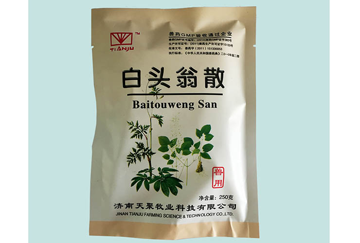 白头翁散 【主要成分】白头翁、黄连、黄柏、秦皮 【功能主治】清热解毒,凉血止痢。主治湿热下痢,下痢脓血。对大肠杆菌、沙门氏菌、巴氏杆菌所致的各种畜禽急性腹泻和肠炎及病毒性腹泻和过敏性腹泻等,均有显著疗效。 【用法用量】混饲:禽本品250g配料150kg,连用3-5天,重症时可加倍用药;猪、羊50-100g;马、牛200-400g。 混饮:本品1000g,加入6kg水中,煎煮30分钟,倒出煎液稀释至600kg水中用于治疗。煎过的药渣用于拌料。 【包装】250g/袋